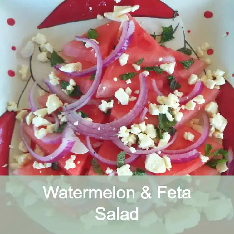 - Place watermelon and red onion on a serving plate. Sprinkle over mint and crumble over feta cheese